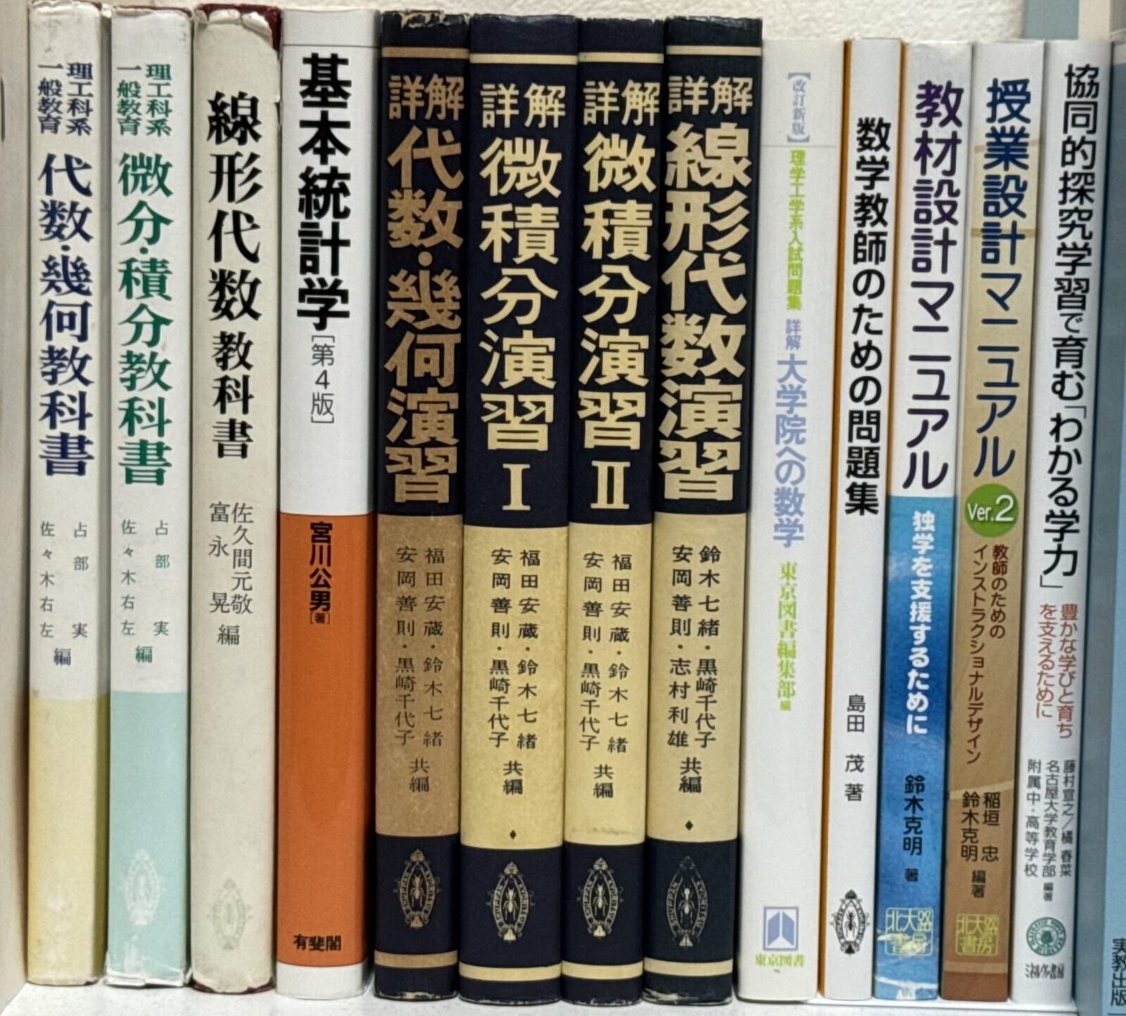 今回は,教材研究に使うことが多い本である.学生時代に,教育の目的は教育学に,方法は心理学に,内容は数学に求めよ,と指導を受けてきた.そのため.教師になって教材研究をするときは,必ず数学書に目を通すようにしている.高等学校の数学の各単元に応じた本に目を通すようにしているので,写真よりもう少し本は多いのだが,今回は目を通すことが多い本をピックアップしてみた.